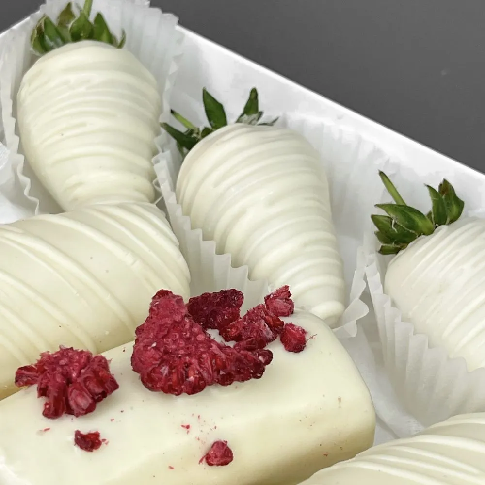 Мы собираем клубничные букеты по весу, а не по штукам. Количество, форма и размер ягод могут отличаться — ведь каждая ягода уникальна.