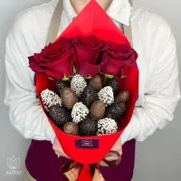 Состав: клубника в шоколаде 220 г, роза одноголовая 3 шт. Букет из свежей клубники в бельгийском шоколаде и живых цветов. Клубника держится на каркасе из шпажек. Ягода отделена от цветов прозрачной пленкой. Готовый букет упаковывается в прозрачную слюду. Фирменная открытка-инструкция по хранению — в подарок. Этот букет — идеальный способ выразить чувства: ко дню рождения, годовщине, 8 Марта, 14 Февраля, Дню матери, Дню учителя, Дню бабушки и дедушки или просто в знак внимания и заботы. Букет из клубники и цветов — съедобный букет — отличный подарок бабушке, маме, любимой женщине, жене, подруге, сестре, друзьям и коллеге.