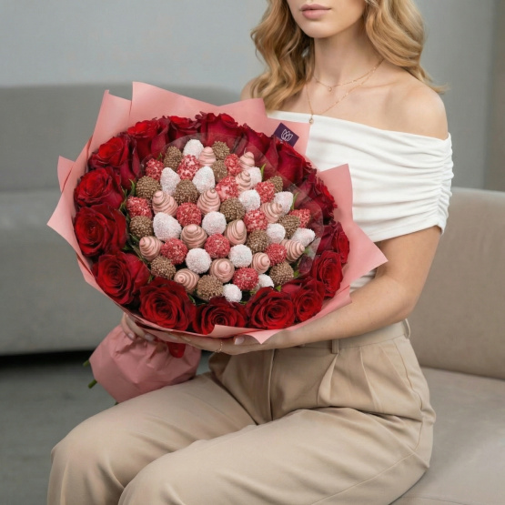 Букет из свежей клубники в бельгийском шоколаде и живых цветов. Клубника держится на каркасе из шпажек. Ягода отделена от цветов прозрачной пленкой. Готовый букет упаковывается в прозрачную слюду.