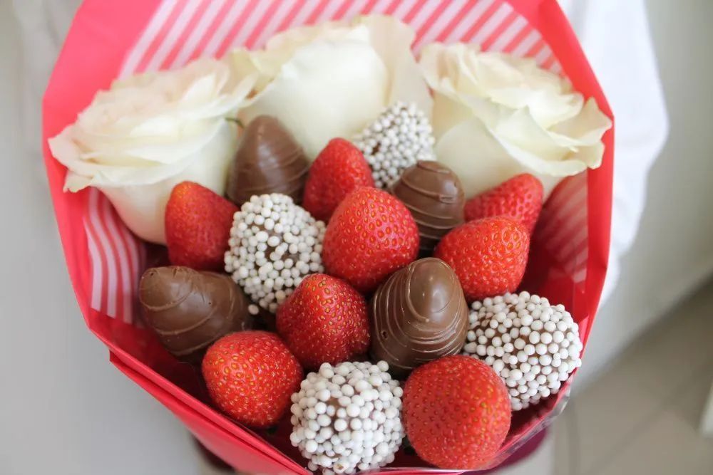 Мы собираем клубничные букеты по весу, а не по штукам. Количество, форма и размер ягод могут отличаться — ведь каждая ягода уникальна.