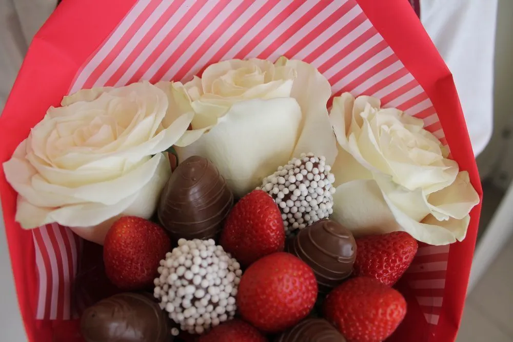 Состав : Клубника в шоколаде, Клубника без шоколада, Роза одноголовая
