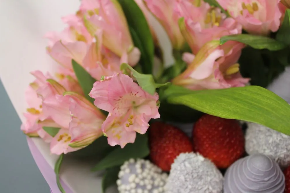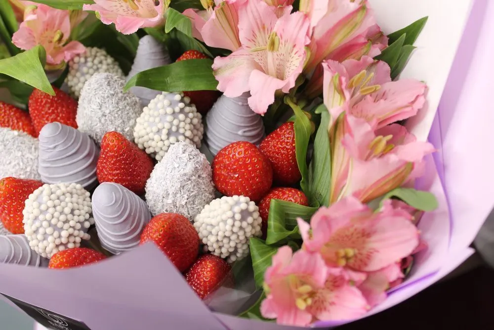 Состав: клубника в шоколаде 175 г, клубника без шоколада 175 г, альстромерия 5 шт. Букет из свежей клубники в бельгийском шоколаде и живых цветов. Клубника держится на каркасе из шпажек. Ягода отделена от цветов прозрачной пленкой. Готовый букет упаковывается в прозрачную слюду. Фирменная открытка-инструкция по хранению — в подарок. Этот букет — идеальный способ выразить чувства: ко дню рождения, годовщине, 8 Марта, 14 Февраля, Дню матери, Дню учителя, Дню бабушки и дедушки или просто в знак внимания и заботы. Букет из клубники и цветов — съедобный букет — отличный подарок бабушке, маме, любимой женщине, жене, подруге, сестре, друзьям и коллеге.