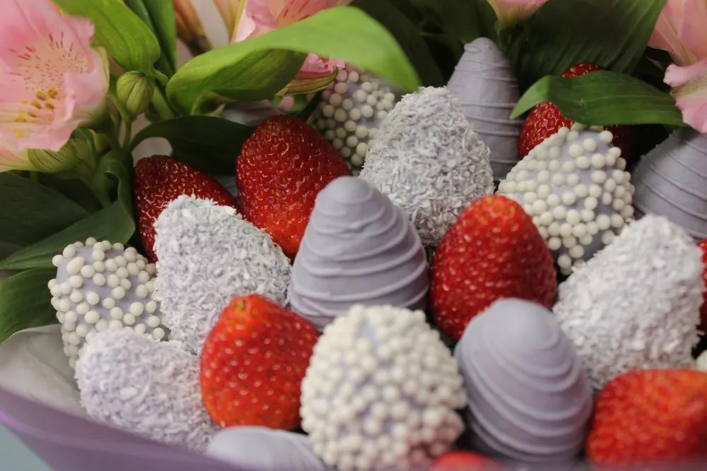 Мы собираем клубничные букеты по весу, а не по штукам. Количество, форма и размер ягод могут отличаться — ведь каждая ягода уникальна.
