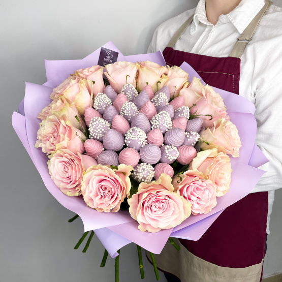 Букет из свежей клубники в бельгийском шоколаде и живых цветов. Клубника держится на каркасе из шпажек. Ягода отделена от цветов прозрачной пленкой. Готовый букет упаковывается в прозрачную слюду. Фирменная открытка-инструкция по хранению — в подарок. Этот букет — идеальный способ выразить чувства: ко дню рождения, годовщине, 8 Марта, 14 Февраля, Дню матери, Дню учителя, Дню бабушки и дедушки или просто в знак внимания и заботы. Букет из клубники и цветов — съедобный букет — отличный подарок бабушке, маме, любимой женщине, жене, подруге, сестре, друзьям и коллеге.