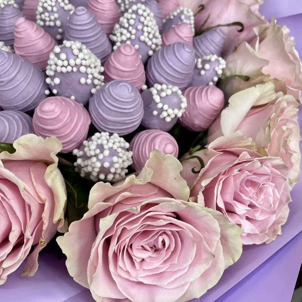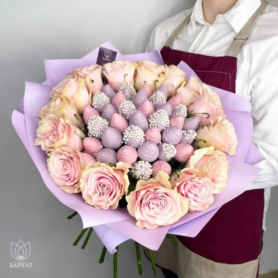Состав: клубника в шоколаде 500 г, роза одноголовая 15 шт. Букет из свежей клубники в бельгийском шоколаде и живых цветов. Клубника держится на каркасе из шпажек. Ягода отделена от цветов прозрачной пленкой. Готовый букет упаковывается в прозрачную слюду. Фирменная открытка-инструкция по хранению — в подарок. Этот букет — идеальный способ выразить чувства: ко дню рождения, годовщине, 8 Марта, 14 Февраля, Дню матери, Дню учителя, Дню бабушки и дедушки или просто в знак внимания и заботы. Букет из клубники и цветов — съедобный букет — отличный подарок бабушке, маме, любимой женщине, жене, подруге, сестре, друзьям и коллеге.