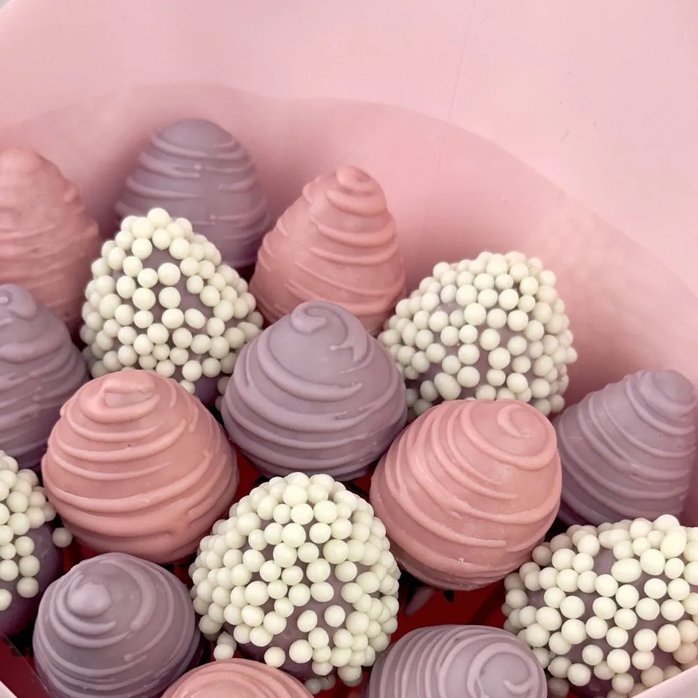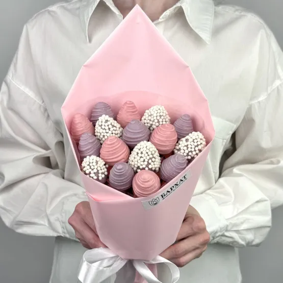 Мы собираем клубничные букеты по весу, а не по штукам. Количество, форма и размер ягод могут отличаться — ведь каждая ягода уникальна.