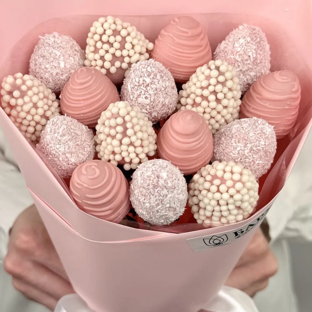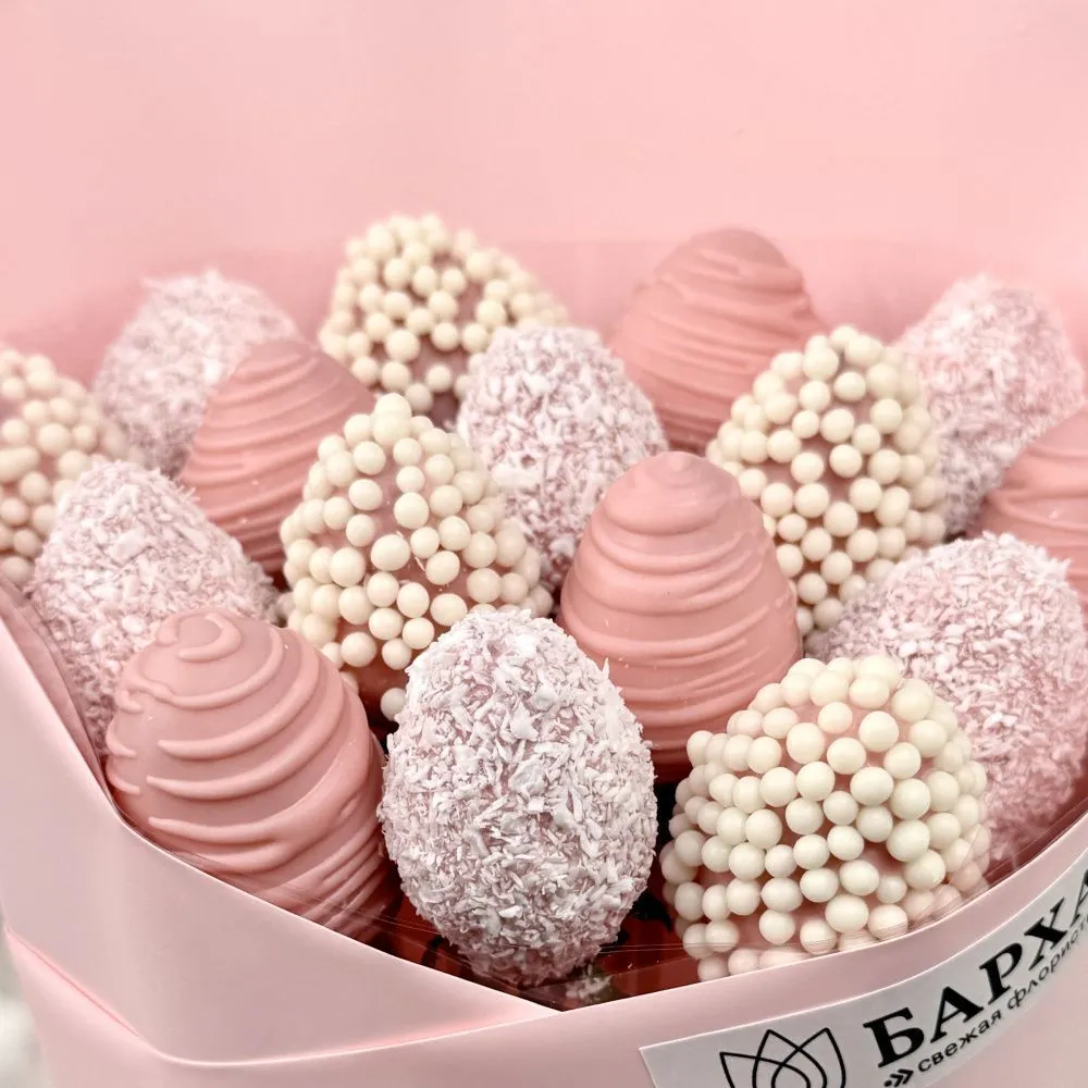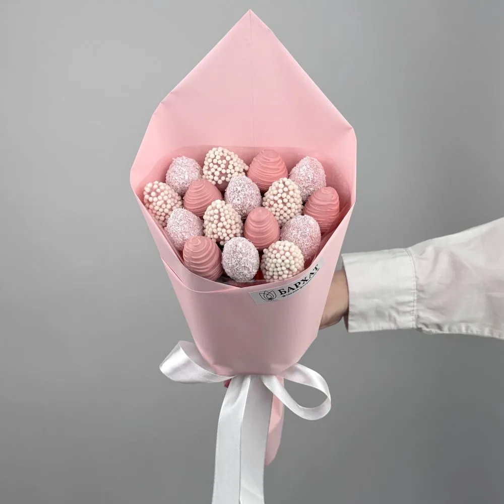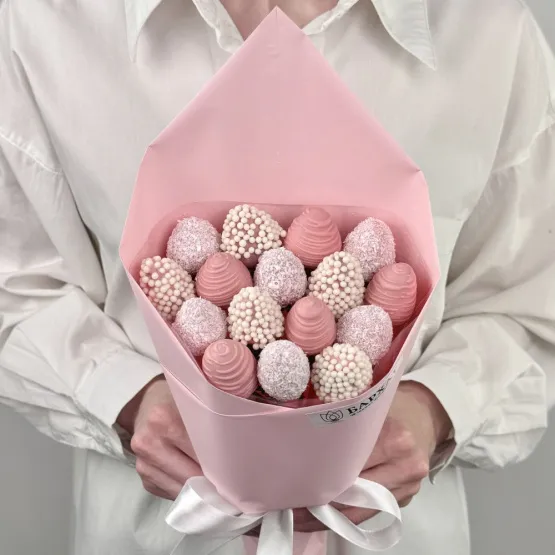 Мы собираем клубничные букеты по весу, а не по штукам. Количество, форма и размер ягод могут отличаться — ведь каждая ягода уникальна.