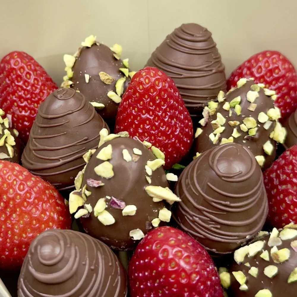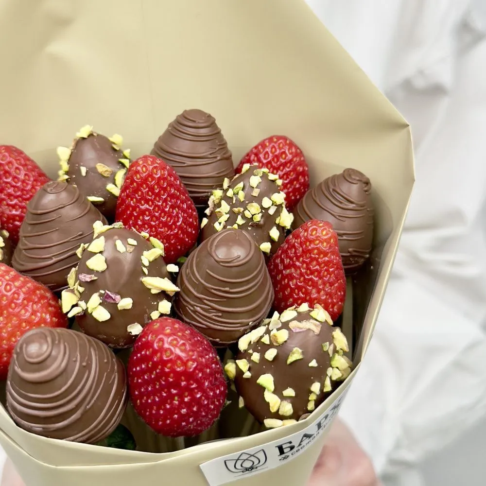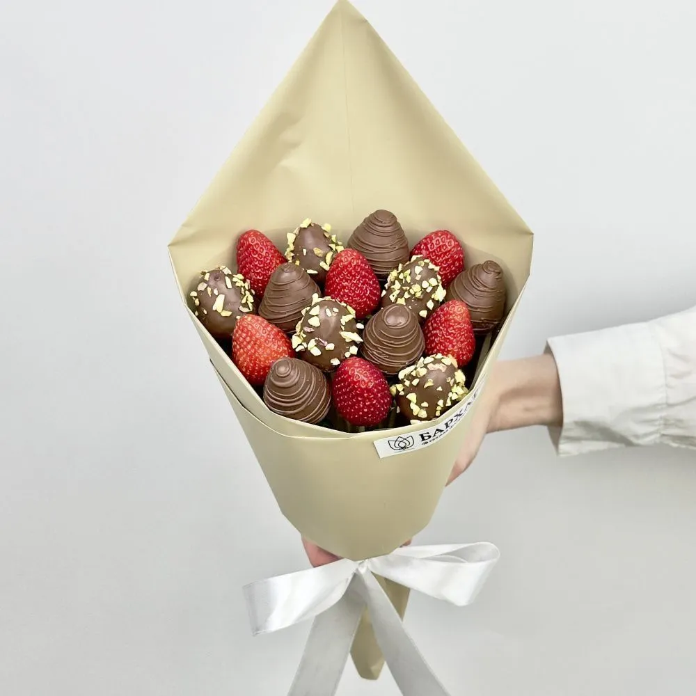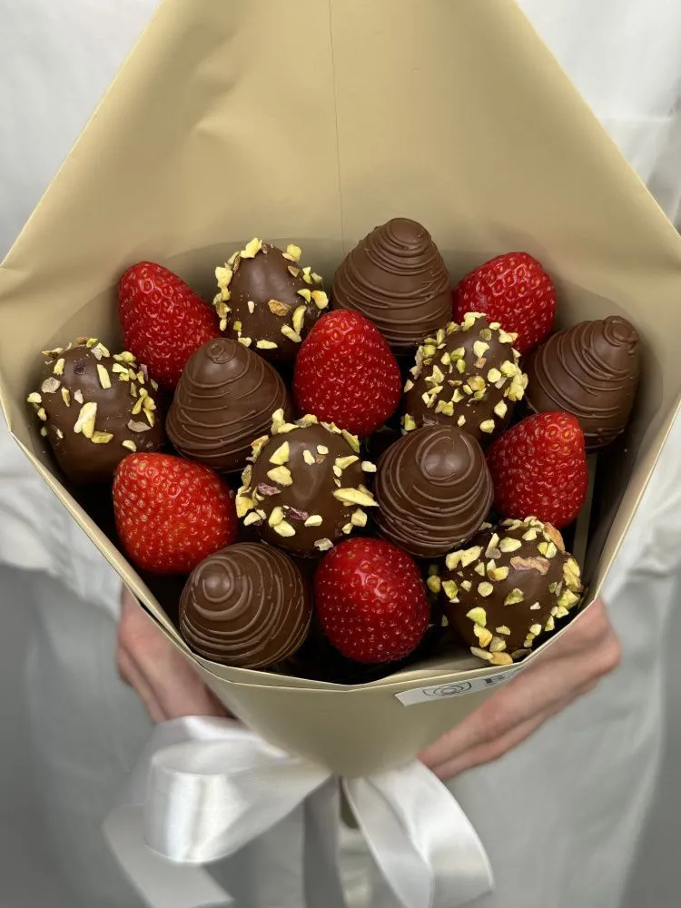 Мы собираем клубничные букеты по весу, а не по штукам. Количество, форма и размер ягод могут отличаться — ведь каждая ягода уникальна.