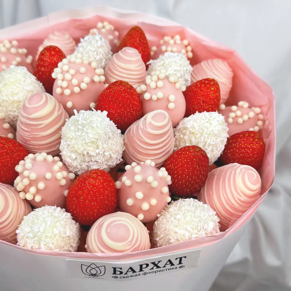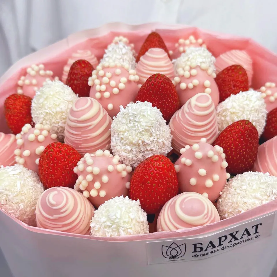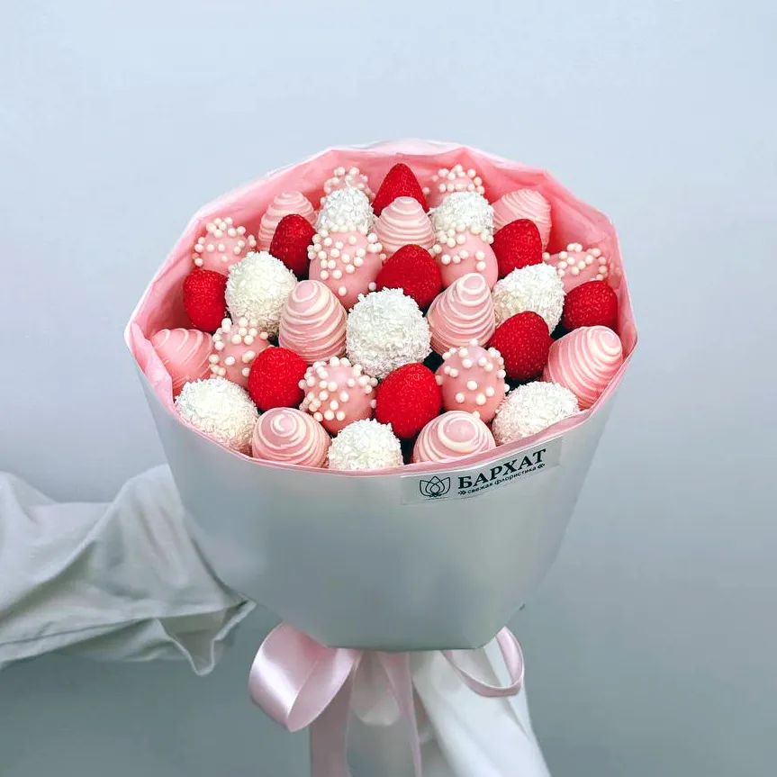 *Обратите внимание: изображение в карточке товара носит иллюстративный характер — реальный букет может незначительно отличаться от фото (например, по размеру клубники, форме и сборке). Точные размеры букета указаны в карточке товара.
