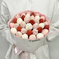 Мы собираем клубничные букеты по весу, а не по штукам. Количество, форма и размер ягод могут отличаться — ведь каждая ягода уникальна.