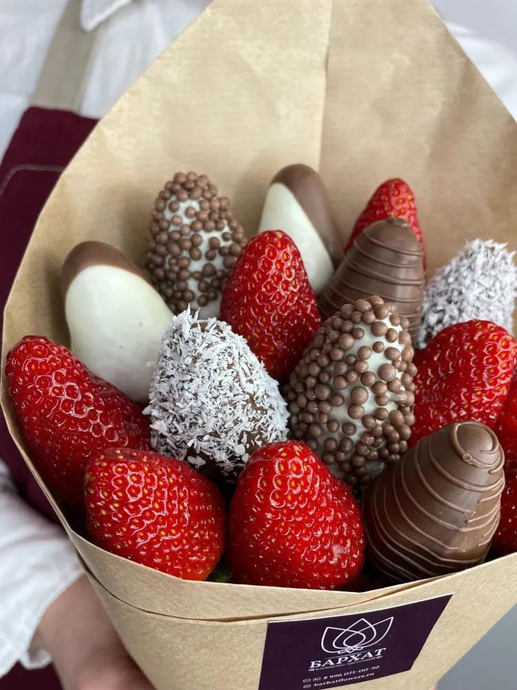 Мы собираем клубничные букеты по весу, а не по штукам. Количество, форма и размер ягод могут отличаться — ведь каждая ягода уникальна.