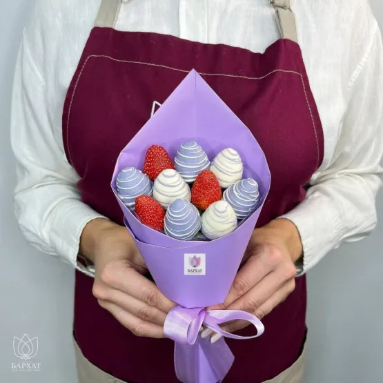 Мы собираем клубничные букеты по весу, а не по штукам. Количество, форма и размер ягод могут отличаться — ведь каждая ягода уникальна.
