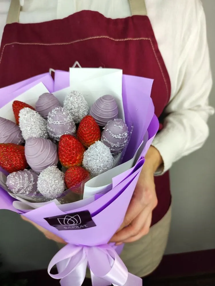 Мы собираем клубничные букеты по весу, а не по штукам. Количество, форма и размер ягод могут отличаться — ведь каждая ягода уникальна.
