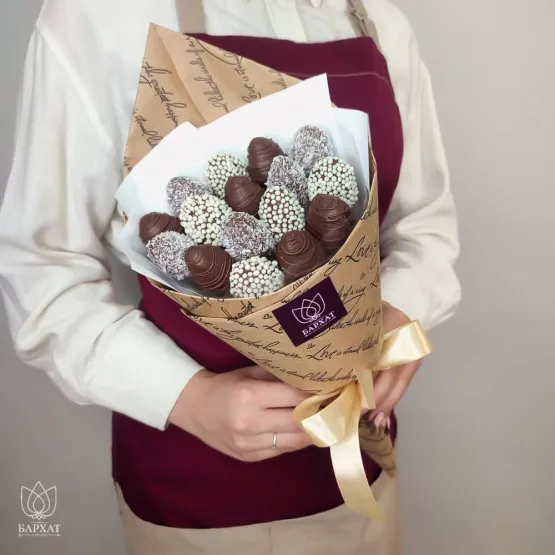 Мы собираем клубничные букеты по весу, а не по штукам. Количество, форма и размер ягод могут отличаться — ведь каждая ягода уникальна.