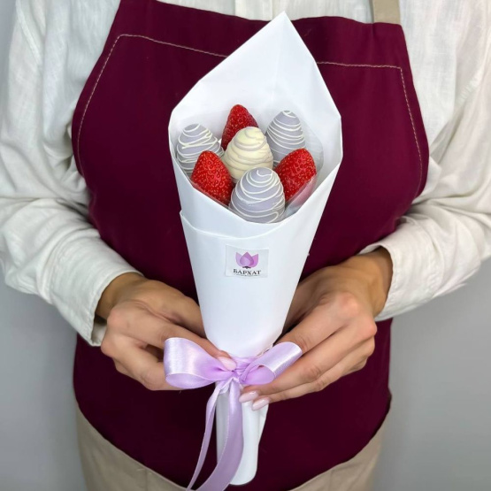 *Обратите внимание: изображение в карточке товара носит иллюстративный характер — реальный букет может незначительно отличаться от фото (например, по размеру клубники, форме и сборке). Точные размеры букета указаны в карточке товара.