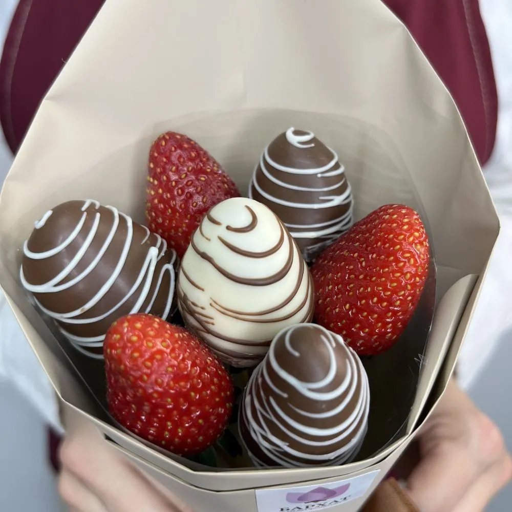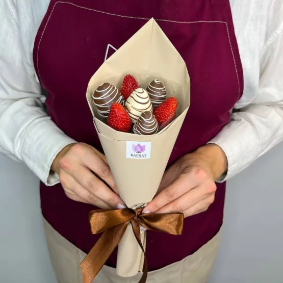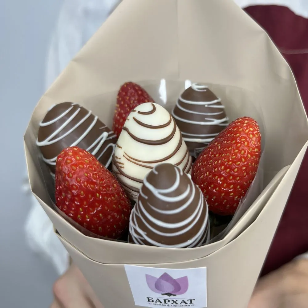 Состав: клубника в шоколаде 50 г, клубника без шоколада 50г. Букет из свежей клубники в бельгийском шоколаде. Клубника держится на каркасе из шпажек. Готовый букет упаковывается в прозрачную слюду. Фирменная открытка-инструкция по хранению — в подарок. Этот букет — идеальный способ выразить чувства: ко дню рождения, годовщине, 8 Марта, 14 Февраля, Дню матери, Дню учителя, Дню бабушки и дедушки или просто в знак внимания и заботы. Букет из клубники — съедобный букет — отличный подарок бабушке, маме, любимой женщине, жене, подруге, сестре, друзьям и коллеге.