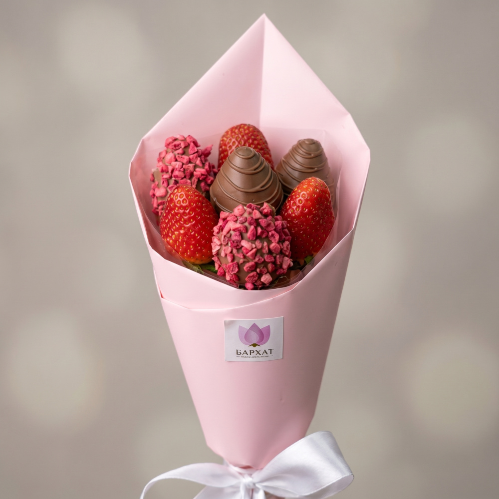 Букет из свежей клубники в бельгийском шоколаде. Клубника держится на каркасе из шпажек. Готовый букет упаковывается в прозрачную слюду. Фирменная открытка-инструкция по хранению — в подарок. Этот букет — идеальный способ выразить чувства: ко дню рождения, годовщине, 8 Марта, 14 Февраля, Дню матери, Дню учителя, Дню бабушки и дедушки или просто в знак внимания и заботы. Букет из клубники — съедобный букет — отличный подарок бабушке, маме, любимой женщине, жене, подруге, сестре, друзьям и коллеге.