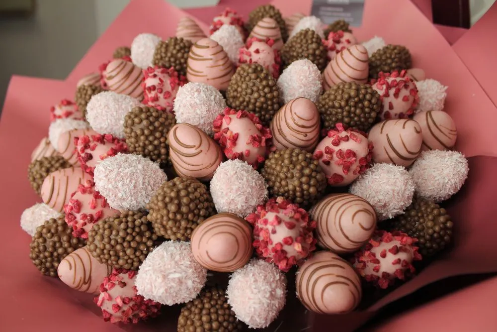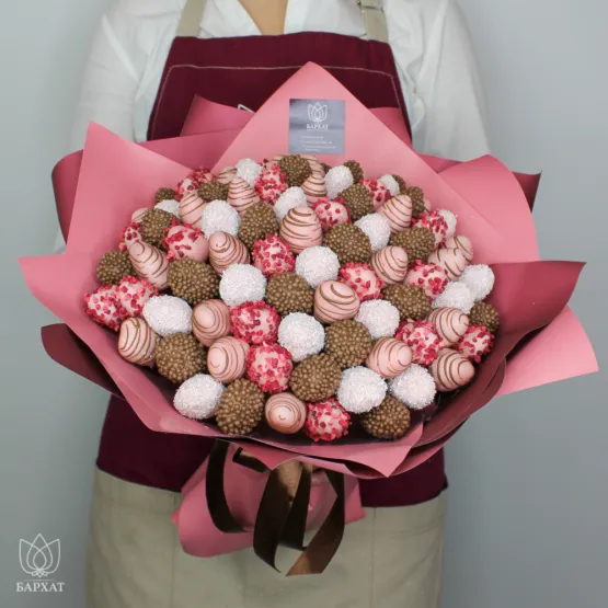 Мы собираем клубничные букеты по весу, а не по штукам. Количество, форма и размер ягод могут отличаться — ведь каждая ягода уникальна.