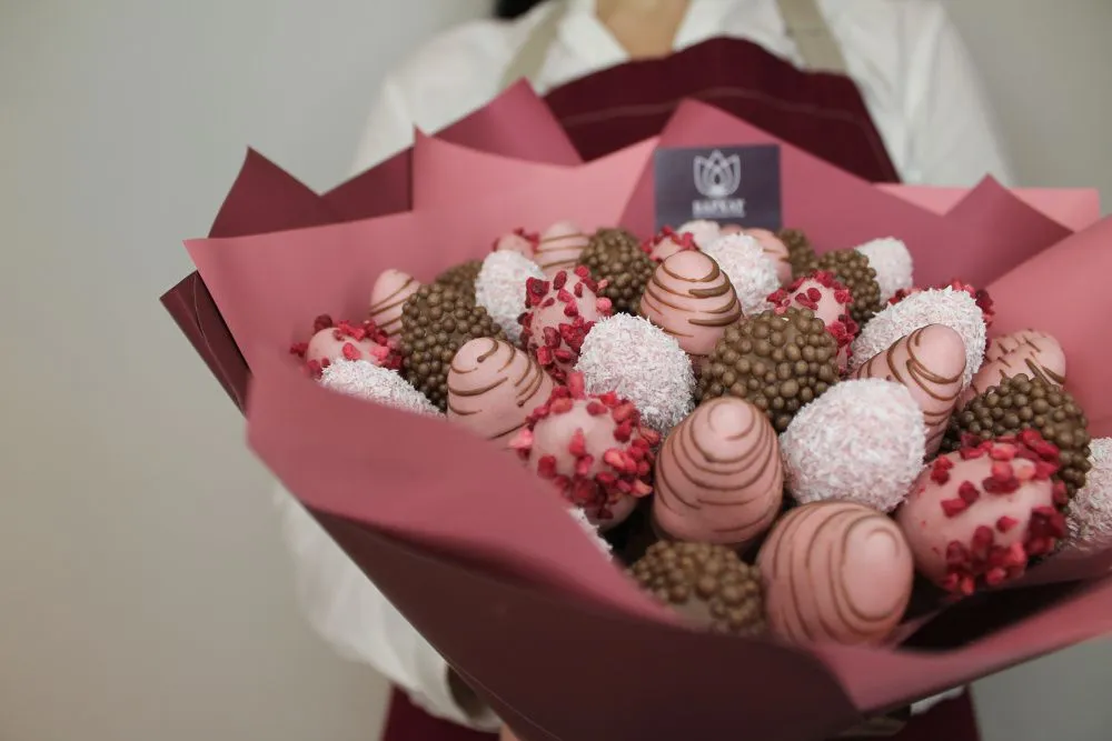 Мы собираем клубничные букеты по весу, а не по штукам. Количество, форма и размер ягод могут отличаться — ведь каждая ягода уникальна.