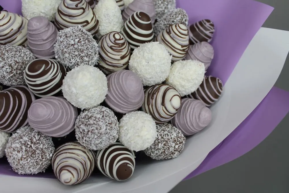 Мы собираем клубничные букеты по весу, а не по штукам. Количество, форма и размер ягод могут отличаться — ведь каждая ягода уникальна.