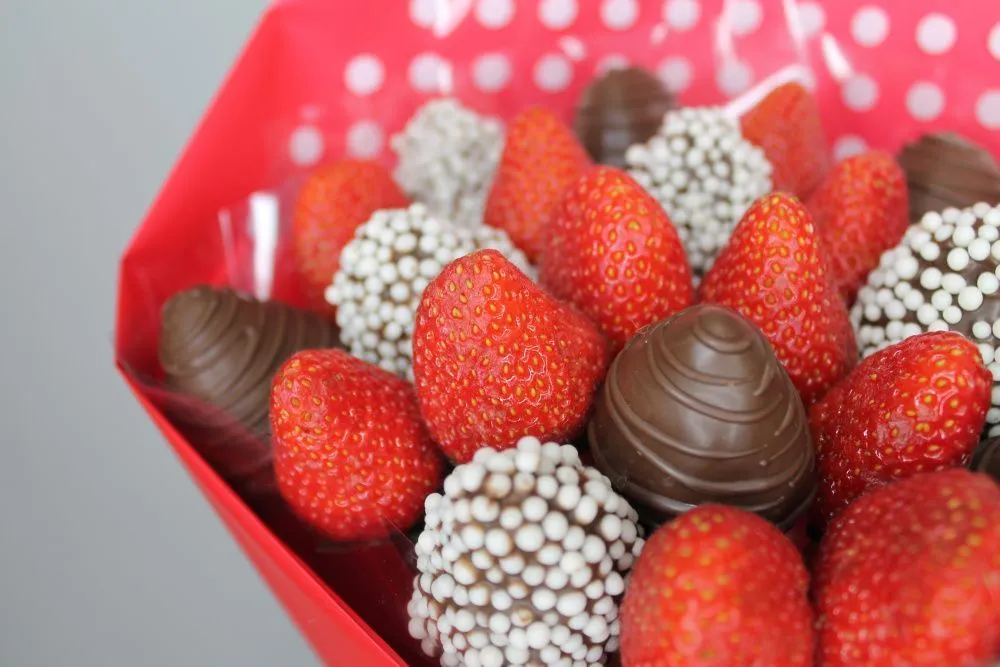 Мы собираем клубничные букеты по весу, а не по штукам. Количество, форма и размер ягод могут отличаться — ведь каждая ягода уникальна.