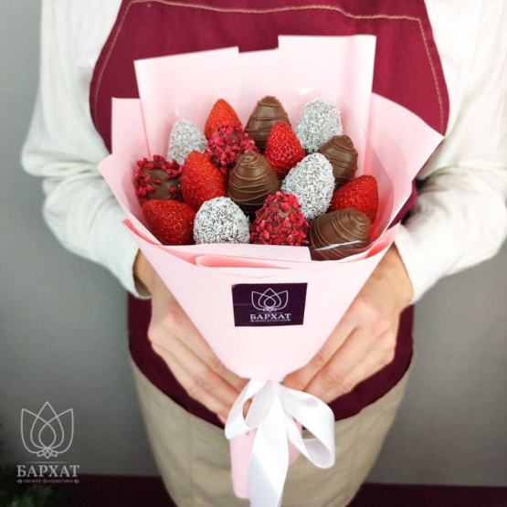 *Обратите внимание: изображение в карточке товара носит иллюстративный характер — реальный букет может незначительно отличаться от фото (например, по размеру клубники, форме и сборке). Точные размеры букета указаны в карточке товара.