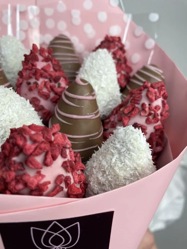 Мы собираем клубничные букеты по весу, а не по штукам. Количество, форма и размер ягод могут отличаться — ведь каждая ягода уникальна.