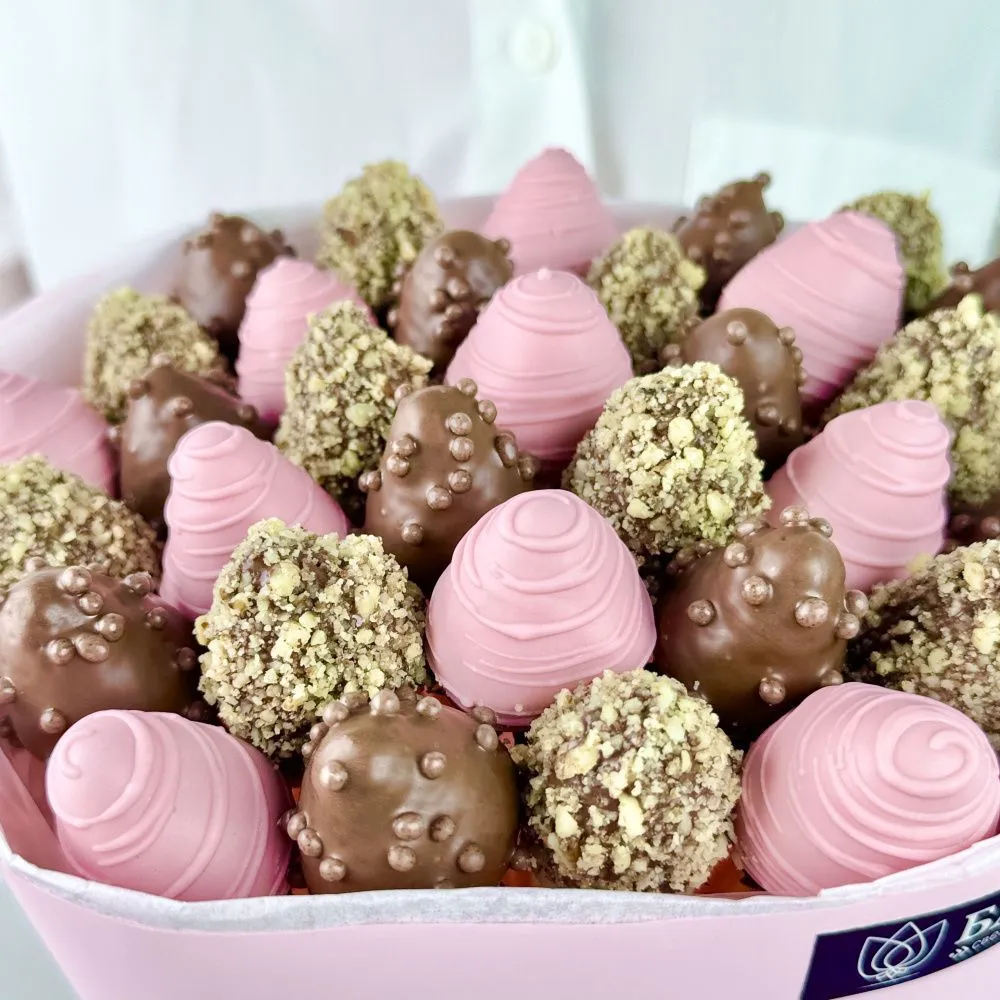 Мы собираем клубничные букеты по весу, а не по штукам. Количество, форма и размер ягод могут отличаться — ведь каждая ягода уникальна.