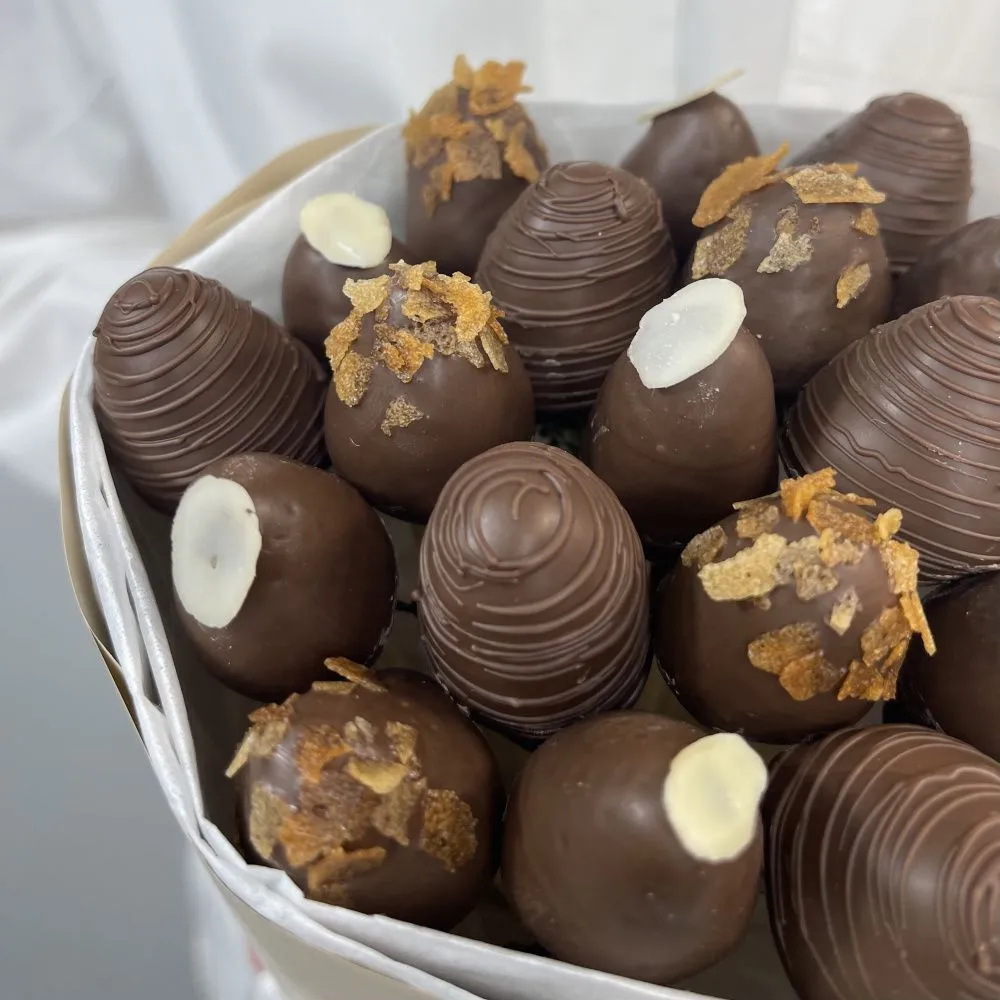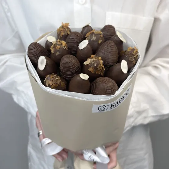 Мы собираем клубничные букеты по весу, а не по штукам. Количество, форма и размер ягод могут отличаться — ведь каждая ягода уникальна.