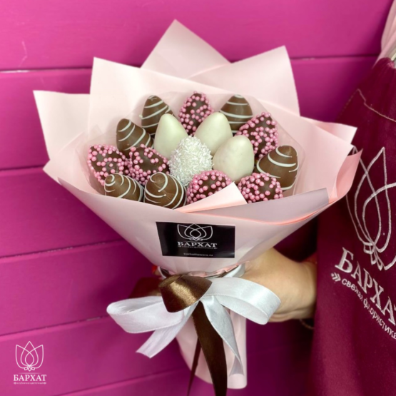 *Обратите внимание: изображение в карточке товара носит иллюстративный характер — реальный букет может незначительно отличаться от фото (например, по размеру клубники, форме и сборке). Точные размеры букета указаны в карточке товара.