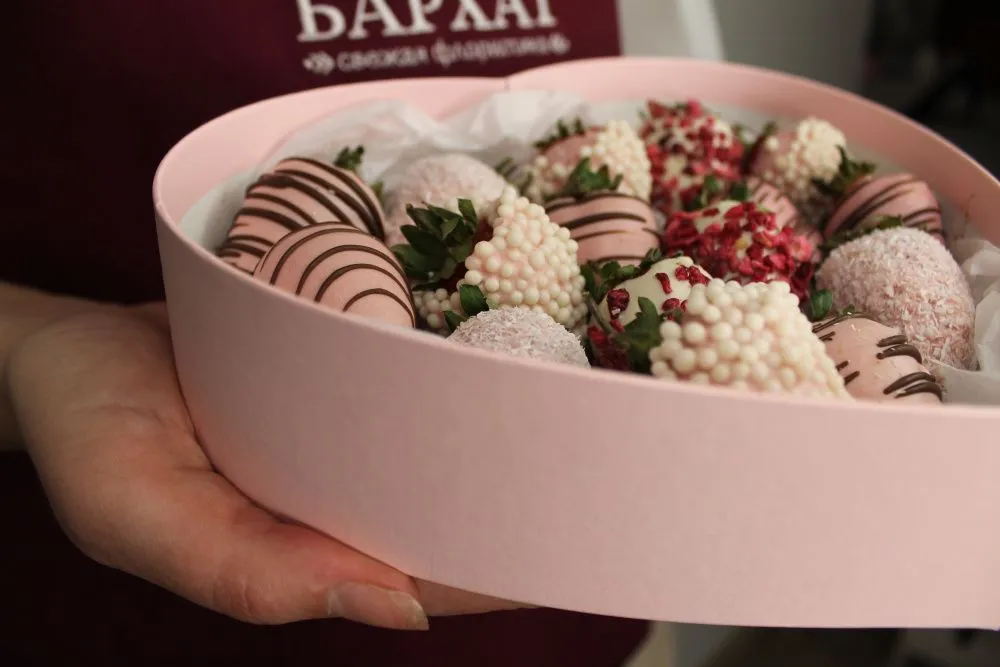 Мы собираем клубничные букеты по весу, а не по штукам. Количество, форма и размер ягод могут отличаться — ведь каждая ягода уникальна.