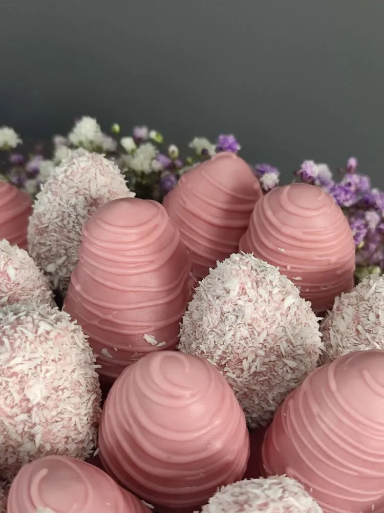 Мы собираем клубничные букеты по весу, а не по штукам. Количество, форма и размер ягод могут отличаться — ведь каждая ягода уникальна.