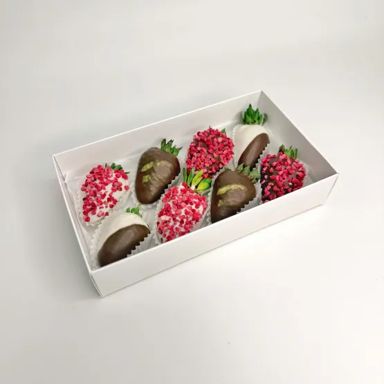 Состав: клубника в шоколаде 8 шт.  Коробочка свежей клубники в фирменном шоколаде. В основе — сочные и сладкие ягоды отборной клубники Альбион, каждая из которых вручную окутана бархатистым фирменным шоколадом и украшена посыпками. Универсальный и беспроигрышный вариант на любой повод: ко дню рождения, годовщине, 8 Марта, 14 Февраля, Дню матери, Дню учителя, Дню бабушки и дедушки или просто в знак внимания и заботы. Коробочка клубники в шоколаде — отличный подарок бабушке, маме, любимой женщине, жене, подруге, сестре, друзьям и коллеге.