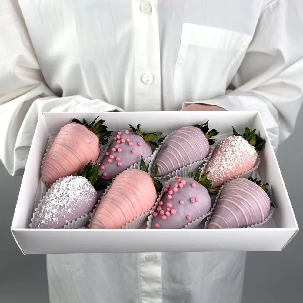 Мы собираем клубничные букеты по весу, а не по штукам. Количество, форма и размер ягод могут отличаться — ведь каждая ягода уникальна.