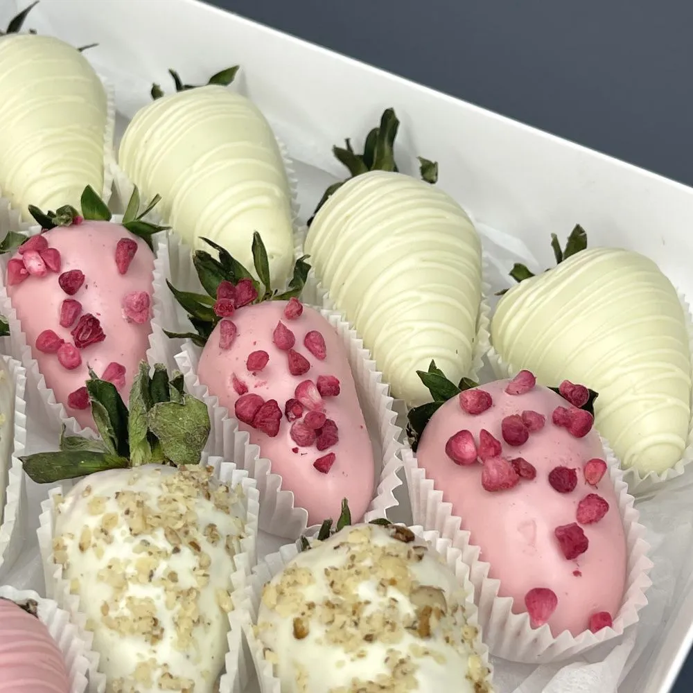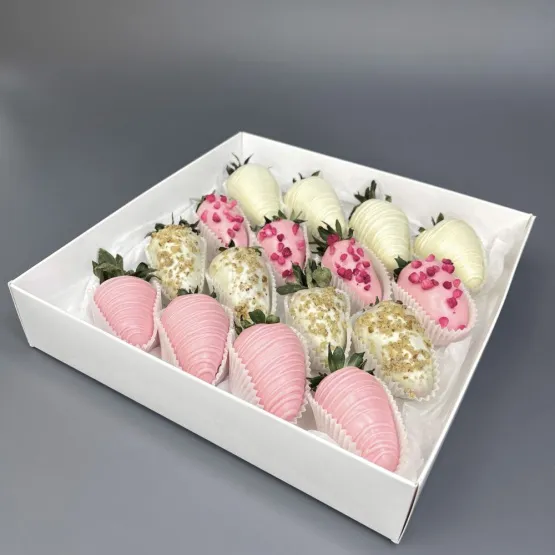 Мы собираем клубничные букеты по весу, а не по штукам. Количество, форма и размер ягод могут отличаться — ведь каждая ягода уникальна.