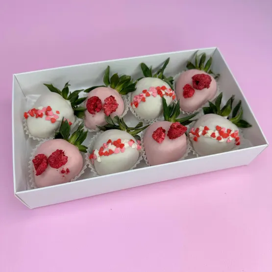 Коробочка свежей клубники в фирменном шоколаде — воплощение нежности и любви. В её основе — сочные ягоды отборной клубники Альбион, каждая из которых вручную окутана бархатистым шоколадом и украшена изящными посыпками. Это безупречный подарок для самого романтичного дня в году — 14 февраля (Дня Святого Валентина).