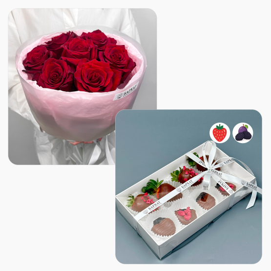 Этот набор — двойной сюрприз для особых моментов. В нём сочетаются свежие цветы и коробочка с изысканными десертами: классическое сочетание нежной клубники в фирменном шоколаде с новым вкусом: сочный чернослив в благородном шоколаде. Чернослив — чемпион по содержанию антиоксидантов с различными посыпками. Идеальный выбор для трогательного признания на 14 февраля (День Святого Валентина), День рождения, 8 Марта, годовщину или без повода. Он создаёт незабываемое впечатление, говоря о ваших чувствах сразу двумя способами. Это роскошный и вкусный сюрприз для любимой женщины, девушки, жены, мамы, подруги или коллеги.