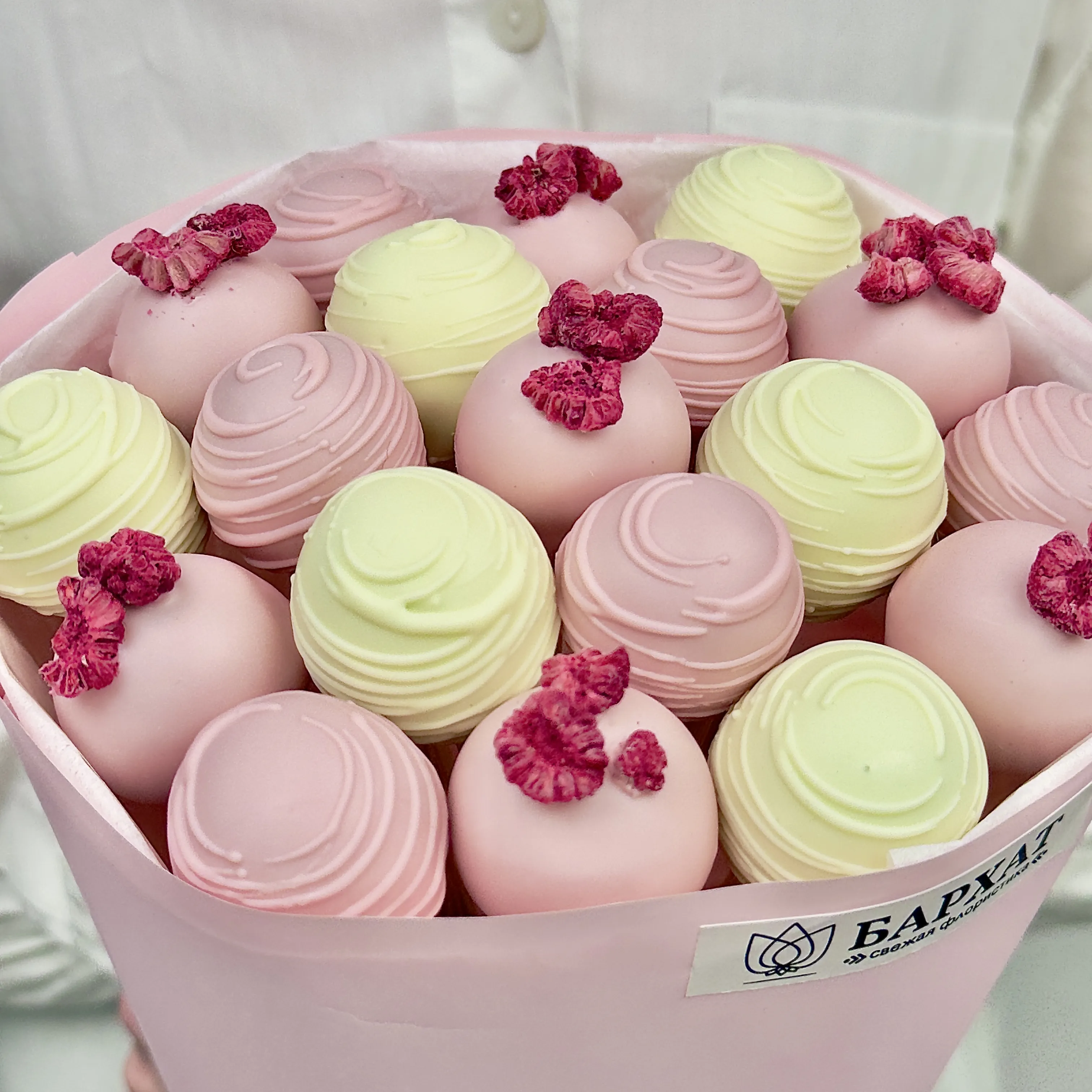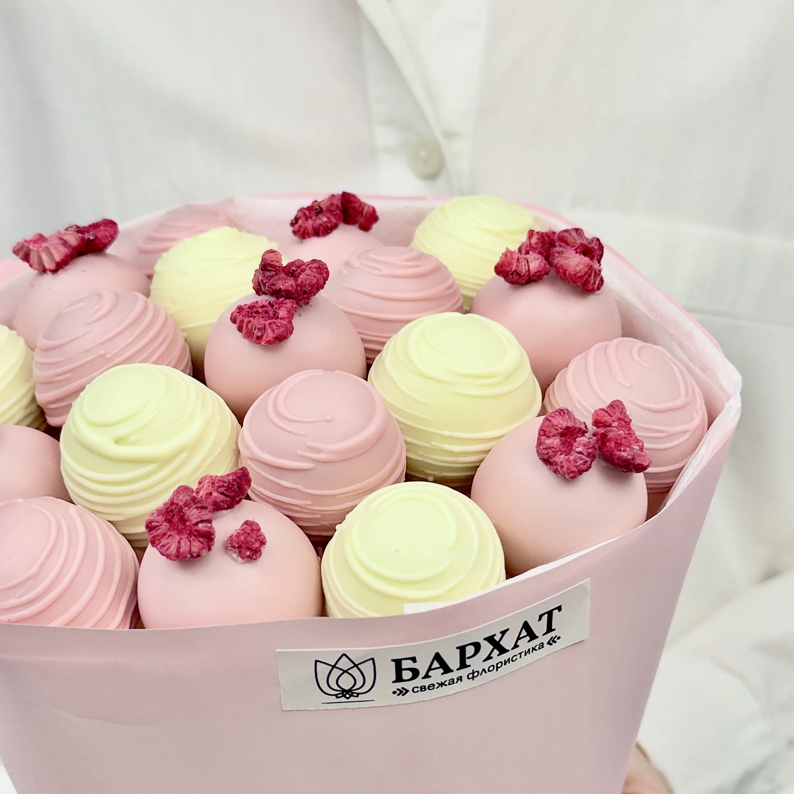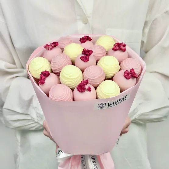 Мы собираем клубничные букеты по весу, а не по штукам. Количество, форма и размер ягод могут отличаться — ведь каждая ягода уникальна.