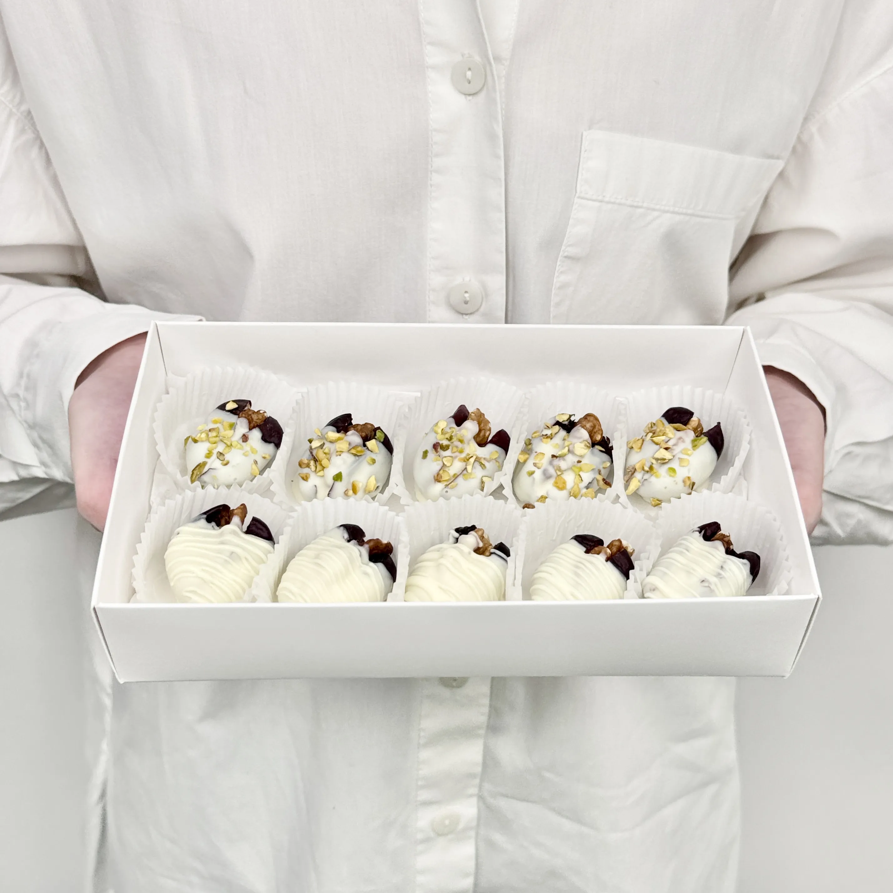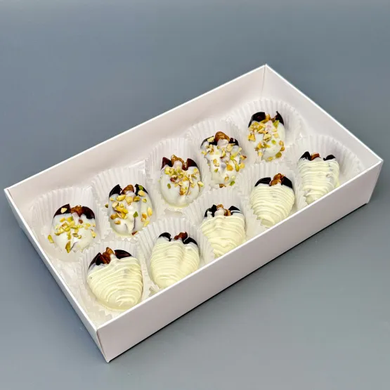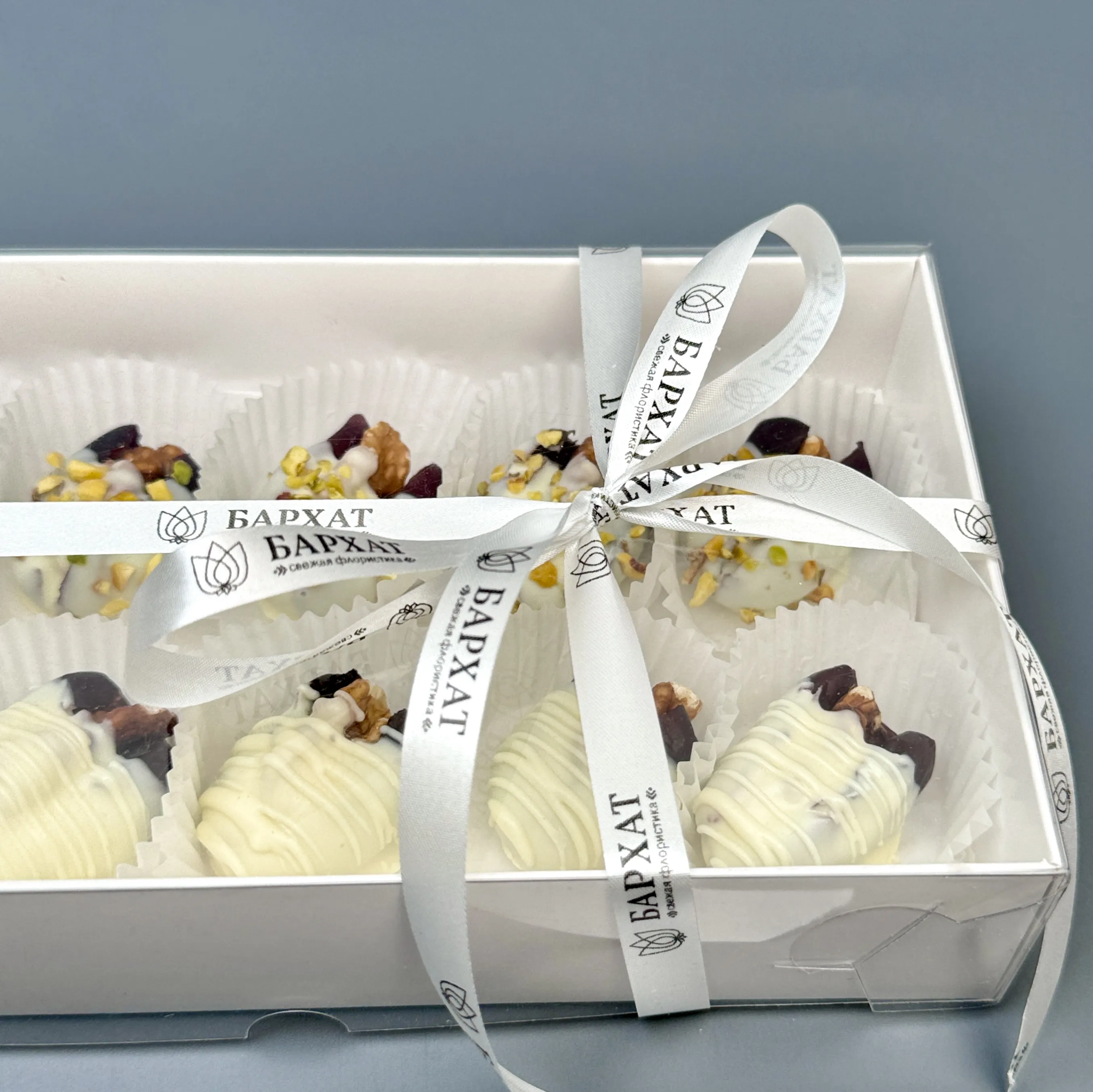 Мы собираем клубничные букеты по весу, а не по штукам. Количество, форма и размер ягод могут отличаться — ведь каждая ягода уникальна.