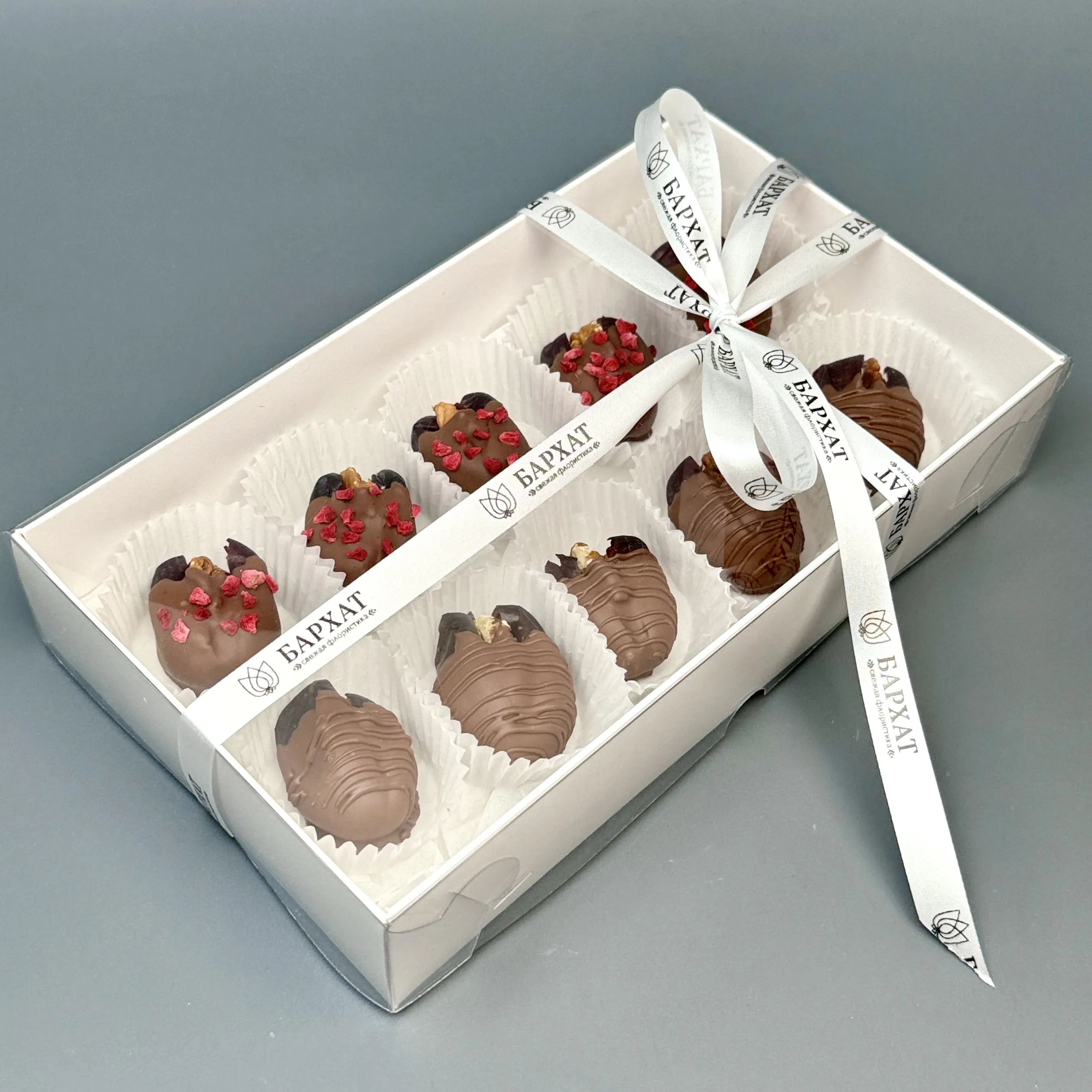 Мы собираем клубничные букеты по весу, а не по штукам. Количество, форма и размер ягод могут отличаться — ведь каждая ягода уникальна.