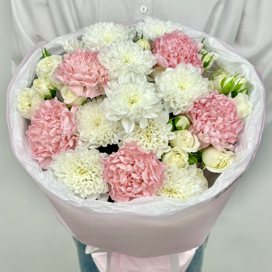 Состав: хризантема кустовая белая 2 шт., роза кустовая белая 3 шт., гвоздика розовая 5 шт. Букет из свежих цветов — идеальный способ выразить чувства: ко дню рождения, годовщине, 8 Марта, 14 Февраля, Дню матери, Дню учителя, Дню бабушки и дедушки или просто в знак внимания и заботы. Фирменная открытка-инструкция по хранению — в подарок. Цветочный букет — отличный подарок бабушке, маме, любимой женщине, жене, подруге, сестре, друзьям и коллеге.