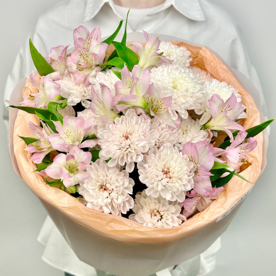 Состав: хризантема кустовая розовая 3 шт., альстромерия розовая 4 шт. Букет из свежих цветов — идеальный способ выразить чувства: ко дню рождения, годовщине, 8 Марта, 14 Февраля, Дню матери, Дню учителя, Дню бабушки и дедушки или просто в знак внимания и заботы. Фирменная открытка-инструкция по хранению — в подарок. Цветочный букет — отличный подарок бабушке, маме, любимой женщине, жене, подруге, сестре, друзьям и коллеге.