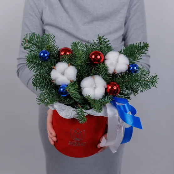 Цветы стоят во флористической губке, которая сохранит безупречный вид и свежесть ветвей. Миниатюрные подарки, мерцающие шары и хвойные ветви создают законченный образ праздника, дарящий уют и настоящее зимнее настроение. Идеальное решение для тех, кто ценит время и стиль!