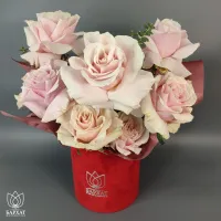 Состав: роза одноголовая 9 шт., эвкалипт 3 шт.  Композиция из цветов, выполненная в фирменном боксе. Цветы стоят на флористической губке. Букет в брендированной коробке — идеальный способ выразить чувства: ко дню рождения, годовщине, 8 Марта, 14 Февраля, Дню матери, Дню учителя, Дню бабушки и дедушки или просто в знак внимания и заботы. Фирменная открытка-инструкция по хранению — в подарок. Цветы в боксе — отличный подарок бабушке, маме, любимой женщине, жене, подруге, сестре, друзьям и коллеге.