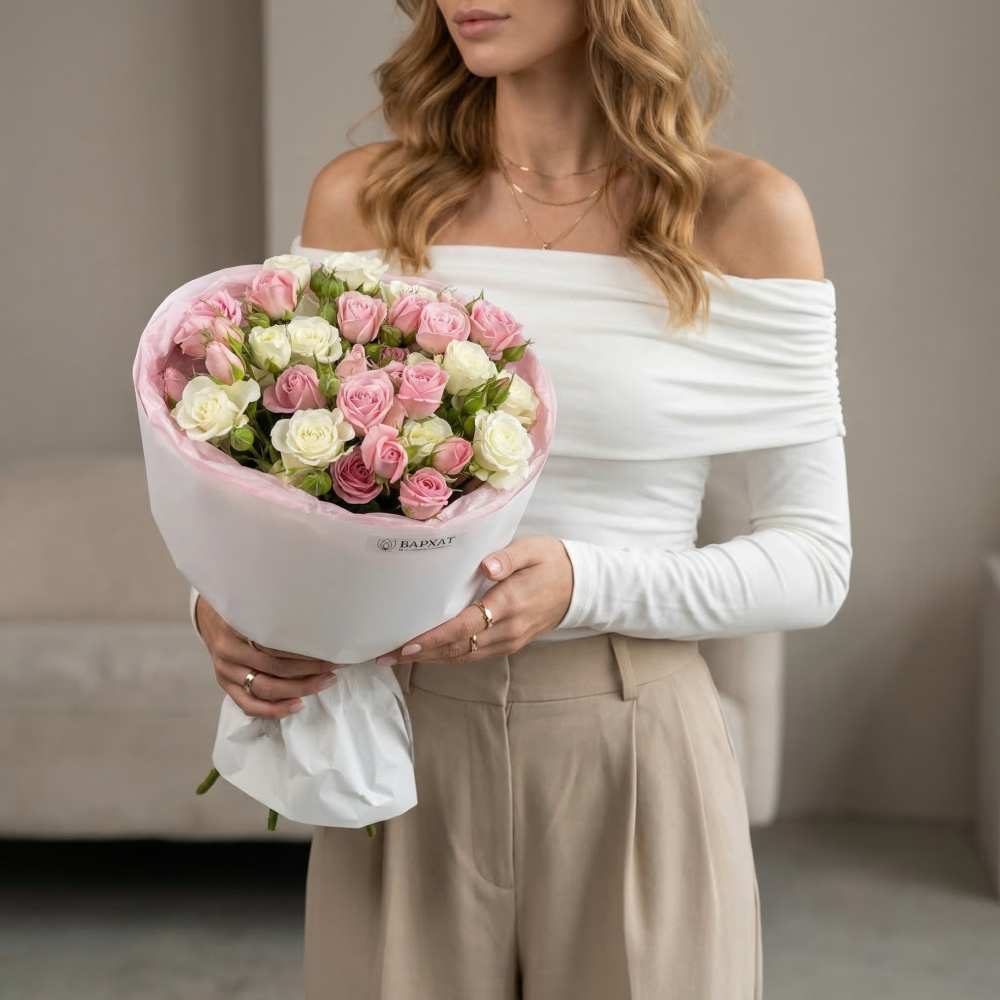 Состав: роза кустовая 5 шт., роза кустовая 4 шт. Букет из свежих цветов — идеальный способ выразить чувства: ко дню рождения, годовщине, 8 Марта, 14 Февраля, Дню матери, Дню учителя, Дню бабушки и дедушки или просто в знак внимания и заботы. Фирменная открытка-инструкция по хранению — в подарок. Цветочный букет — отличный подарок бабушке, маме, любимой женщине, жене, подруге, сестре, друзьям и коллеге.