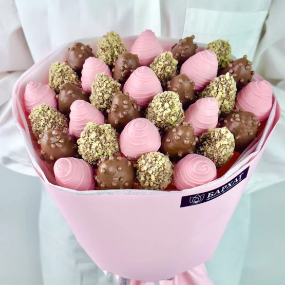 *Обратите внимание: изображение в карточке товара носит иллюстративный характер — реальный букет может незначительно отличаться от фото (например, по размеру клубники, форме и сборке). Точные размеры букета указаны в карточке товара.