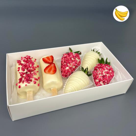 Бананы в шоколаде, Клубника в шоколаде, Клубника без шоколада, Посыпка: Сублимированная малина