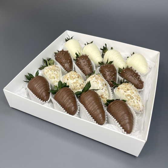 Мы собираем клубничные букеты по весу, а не по штукам. Количество, форма и размер ягод могут отличаться — ведь каждая ягода уникальна.